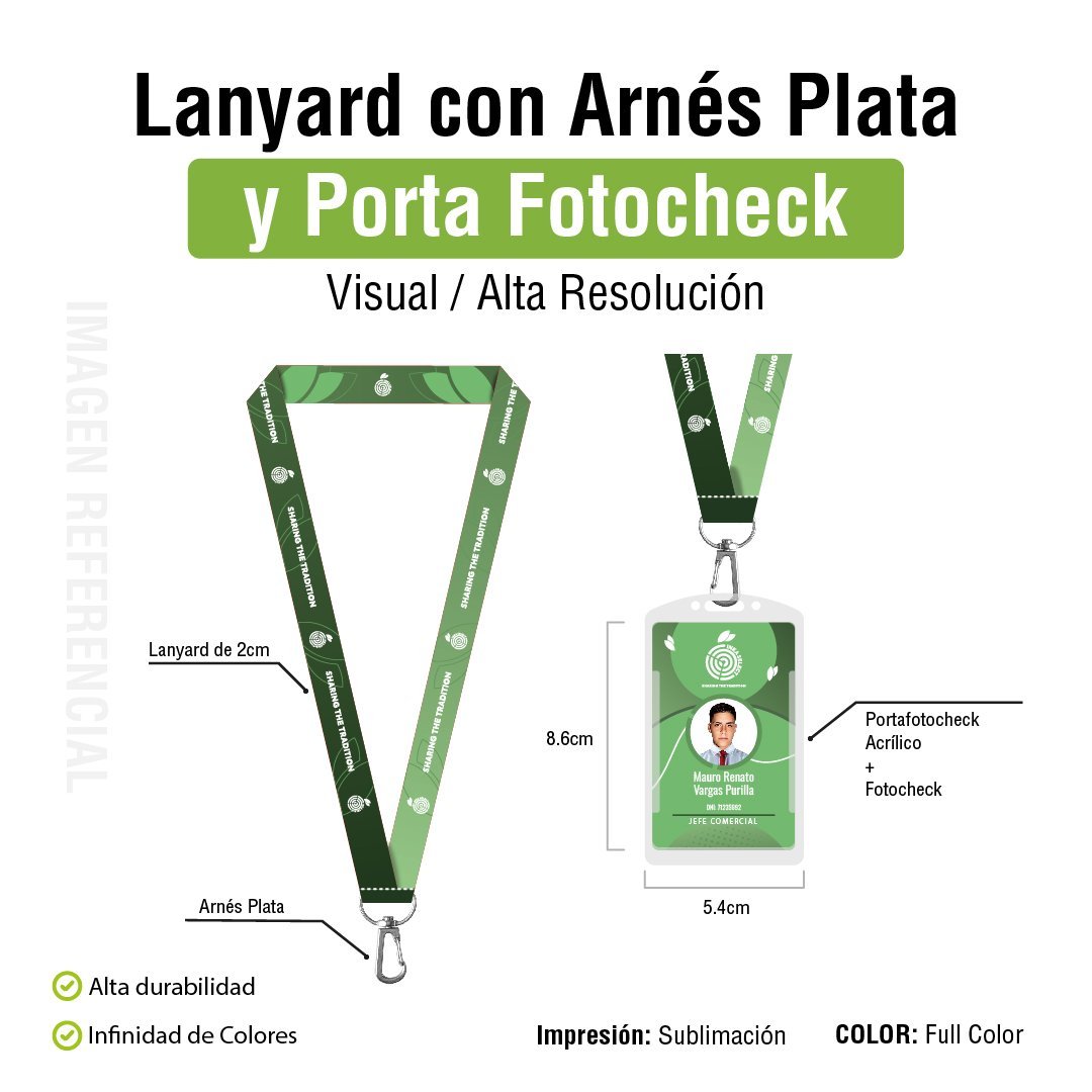 El Lanyard Arnés Plata + Fotocheck es una opción premium para quienes buscan una solución práctica y elegante para portar identificaciones. Con un material de strap de poliéster care importada, este lanyard mide 20 mm de ancho y 90 cm de largo, ofreciendo robustez y comodidad. Su impresión full color digital en ambos lados no solo garantiza visibilidad, sino que también permite personalizarlo según las necesidades de la marca. Incluye un arnés plata y un porta fotocheck, lo que lo hace perfecto para eventos corporativos, conferencias y ferias. Su acabado sublimado digital con costura recta asegura una larga duración y un aspecto profesional en todo momento.