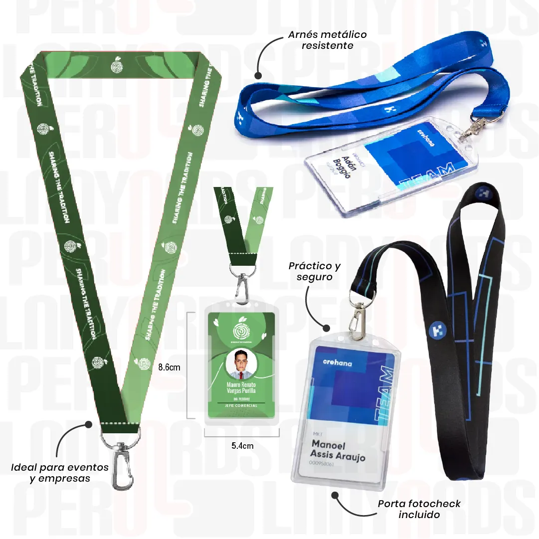 Tu identificación, segura y elegante. Con lanyard sublimado full color y fotocheck con impresión láser o UV, este accesorio resalta tu identidad corporativa mientras asegura comodidad y visibilidad. Ideal para empresas, ferias y actividades de alto impacto visual.