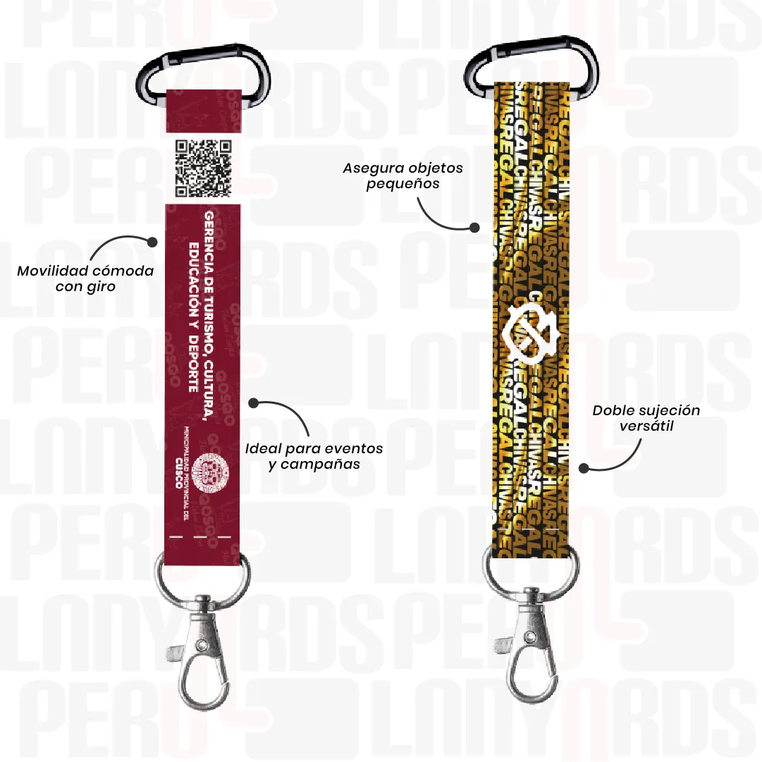 Máxima funcionalidad en un solo accesorio. El carabiner junto al mosquetón giratorio con palanca asegura tus llaves o credenciales con total confianza, mientras la cinta satinada full color refleja estilo y profesionalismo en cada uso.
