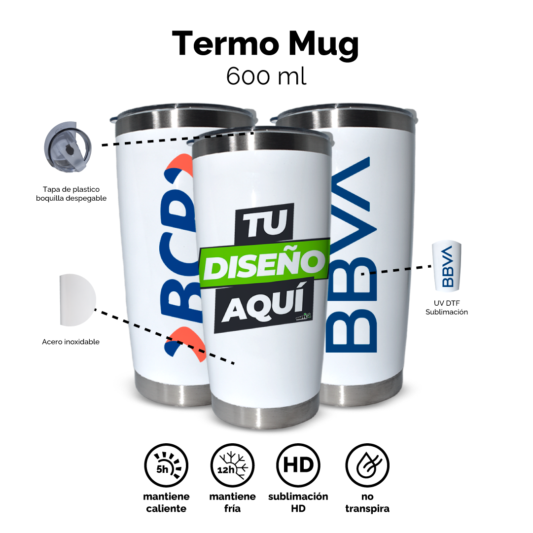 Termo Mug de 590 ml 100% personalizables. Manteniend temperaturas frías y calientes por 12 horas.